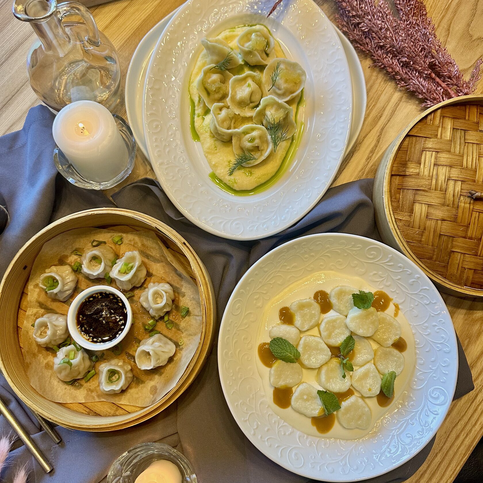 Пельмени с треской с кремом из квашенной капусты и щучьей икрой 500 руб.