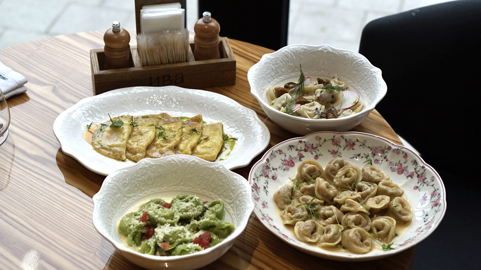 Шпинатные пельмени с курицей и креветкой Подаем с муссом пармезан и томатной сальсой 660
