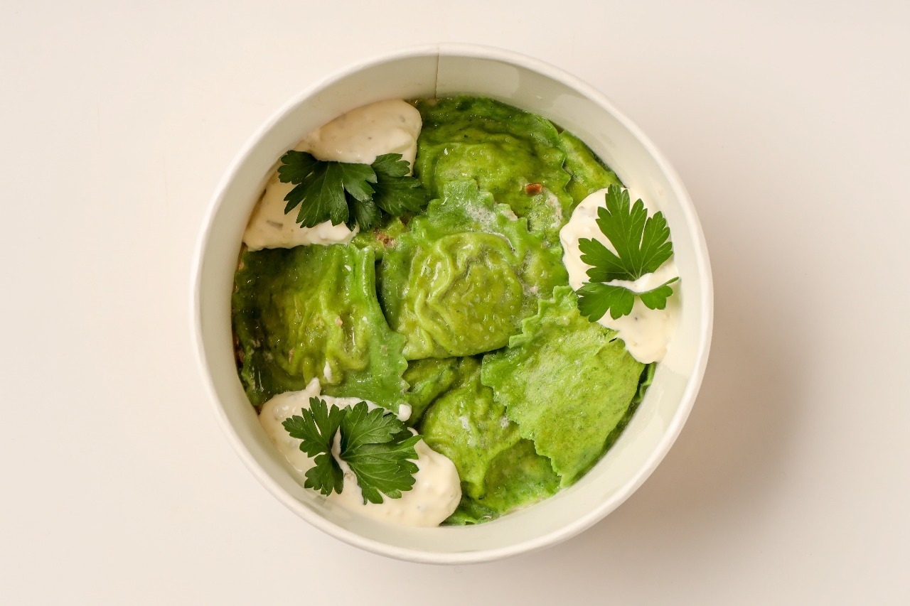 Грибные равиоли, с шампиньонами и вешенками, в сметанно-чесночном соусе 550 р