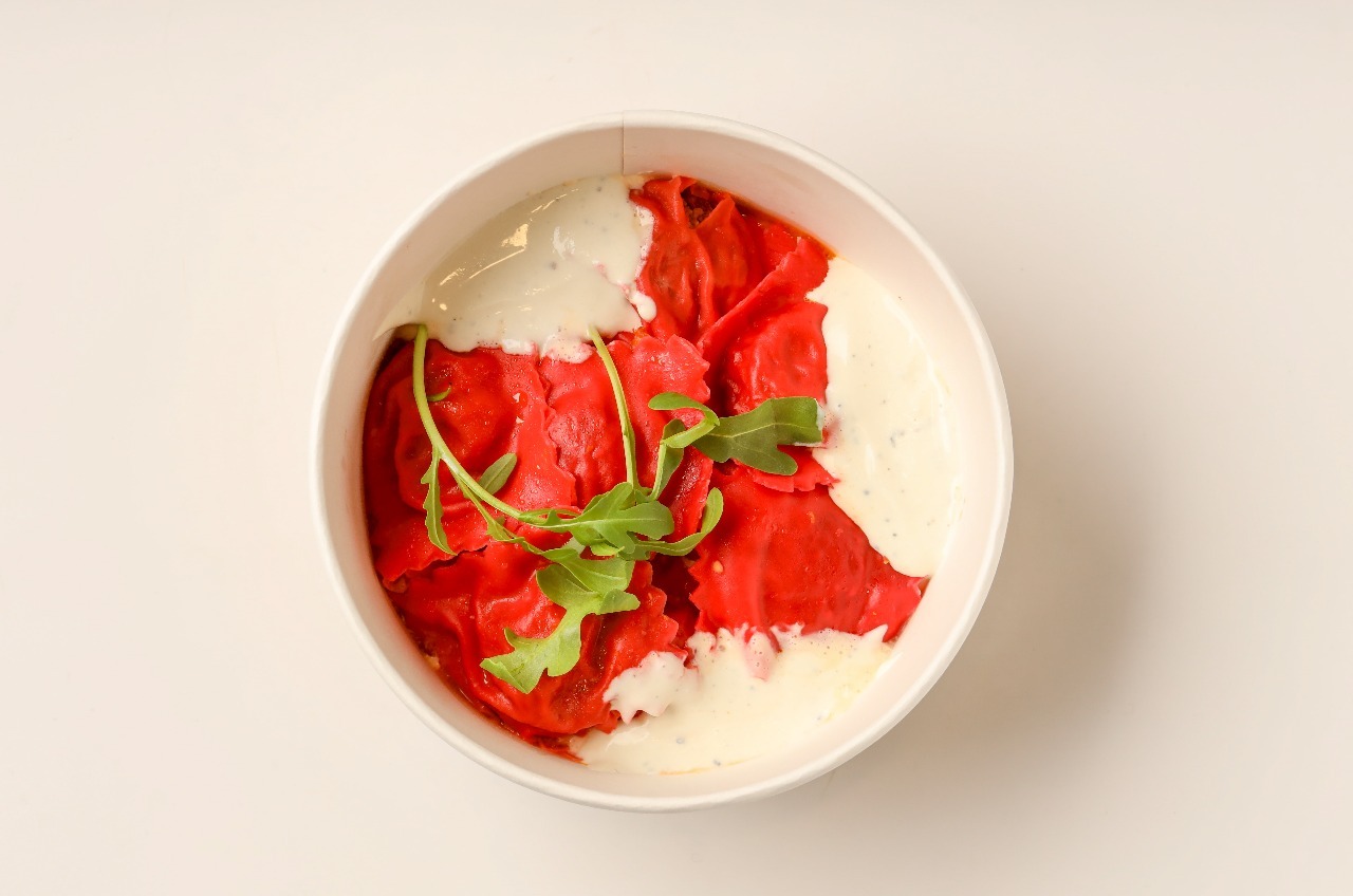 Равиоли с салями пепперони и вялеными томатами под соусом из горгонзолы 550 р