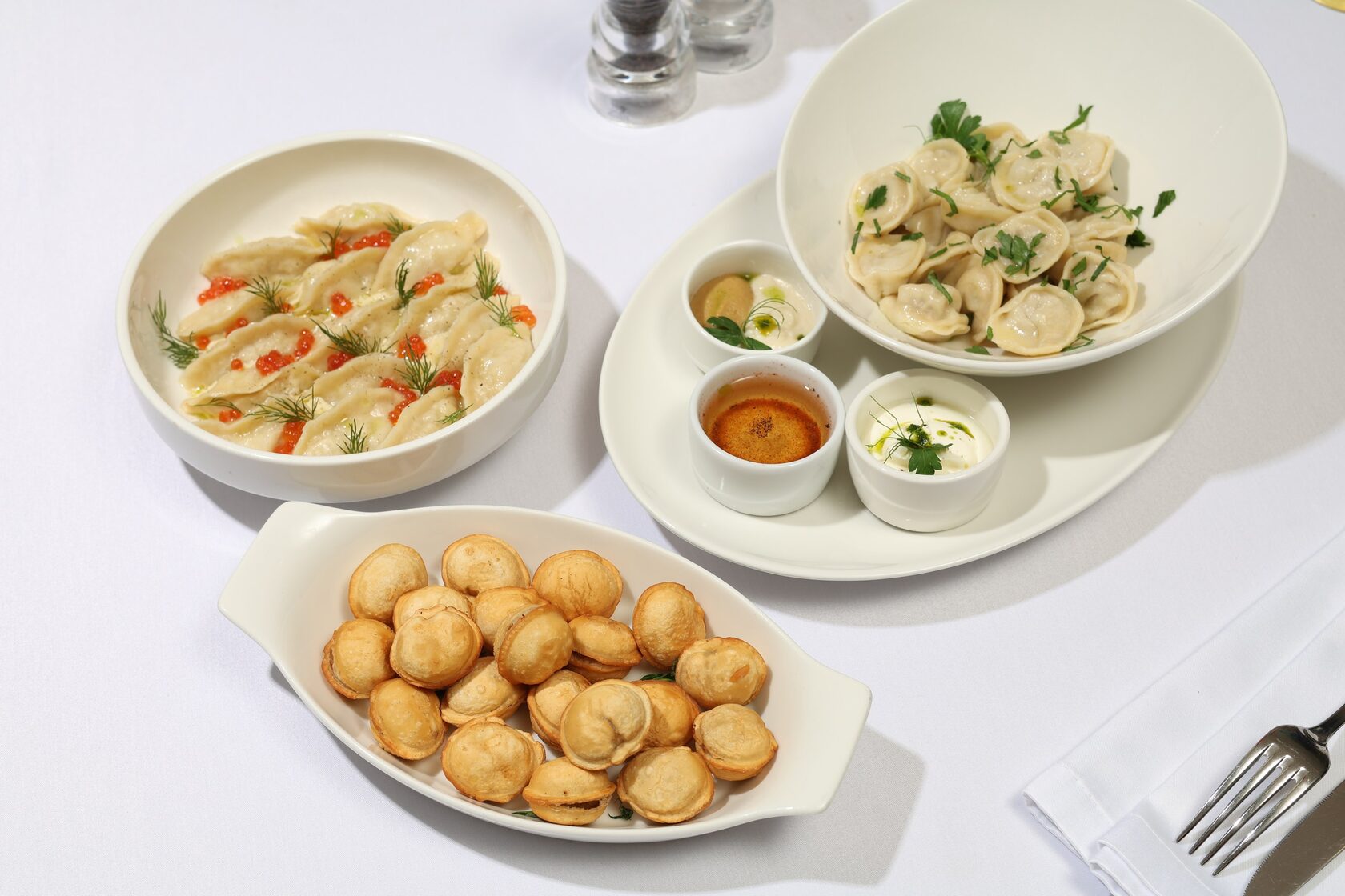 Щучьи пельмени с икрой в винном соусе с укропным маслом 650 руб.